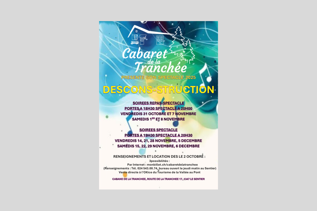 Les vendredis et samedis du 31 octobre au 8 novembre, la troupe de théâtre amateur présente son nouveau spectacle "Descons-struction".En effet, le Cabaret de La Tranchée présente un spectacle incontournable à la Vallée de Joux.